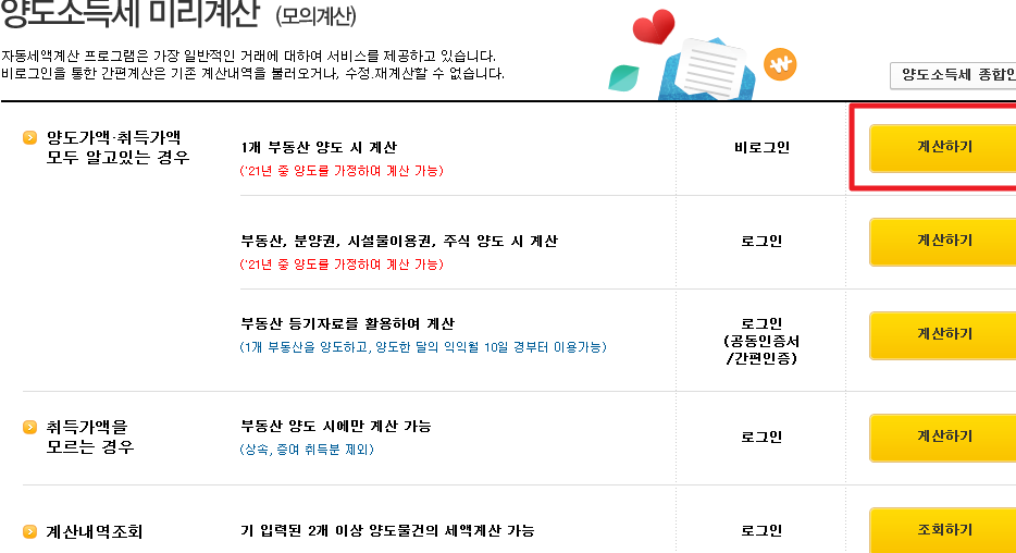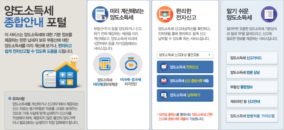 국세청 홈택스 양도소득세 자동계산 방법의 경우 최근 변경된 정책까지 반영되기 때문에 어렵지 않게 양도소득세를 계산할 수 있습니다.