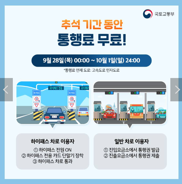 추석 기간 9.28~ 10.1 동안 고속도로 통행료가 면제됩니다.