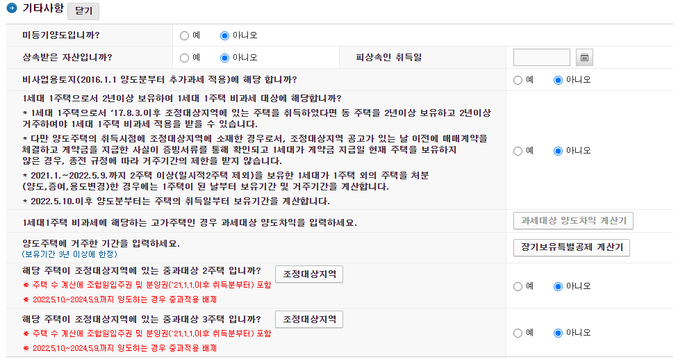 기타 사항에서는 세율 절감 효과가 큰 장기보유특별공제와 조정대상지역 여부를 입력한 세액계산하기를 클릭하면 양도소득세 자동계산이 완료됩니다.