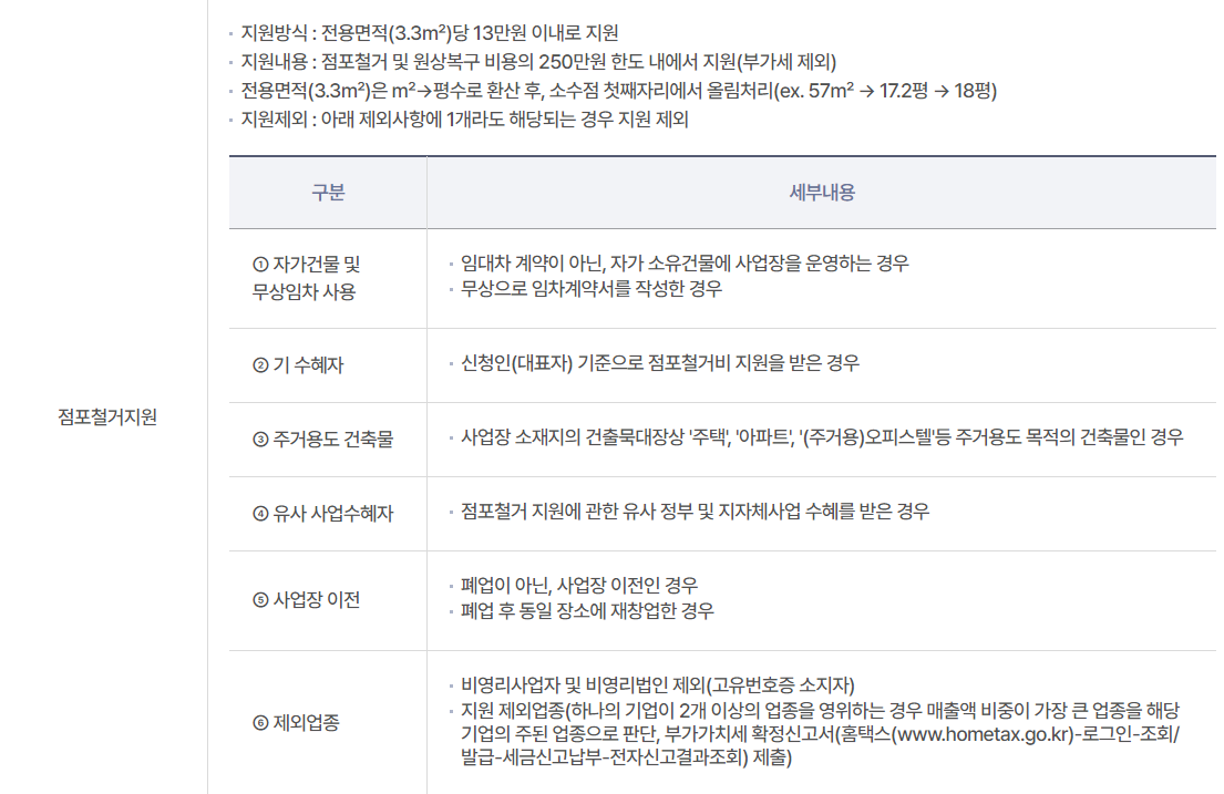 폐업지원금 신청 대상 소상공인이라면 점포 철거 및 원상복구 비용의 250만 원 한도 내에서 지원을 받을 수 있습니다. 전용면적 당 13만 원 이내로 지원되며, 만약 평수가 소수점으로 떨어지는 경우에는 반올림하여 산출됩니다.