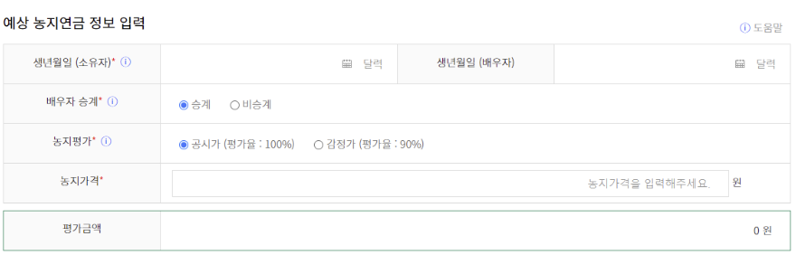 이후 농지은행 홈페이지에서는 농지연금 수령액을 간단하고 쉽게 계산할 수 있도록 예상연금 조회 서비스를 제공하고 있습니다. 농지가격을 입력하면 연금 종류별 예상 연금을 조회할 수 있습니다.
