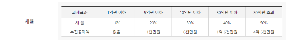 증여세율은 최저 10%부터 최고 50% 까지 5단계 초과누진세율 구조로 되어 있으며, 자세한 증여세율은 아래의 증여세율표를 확인해 보시기 바랍니다.