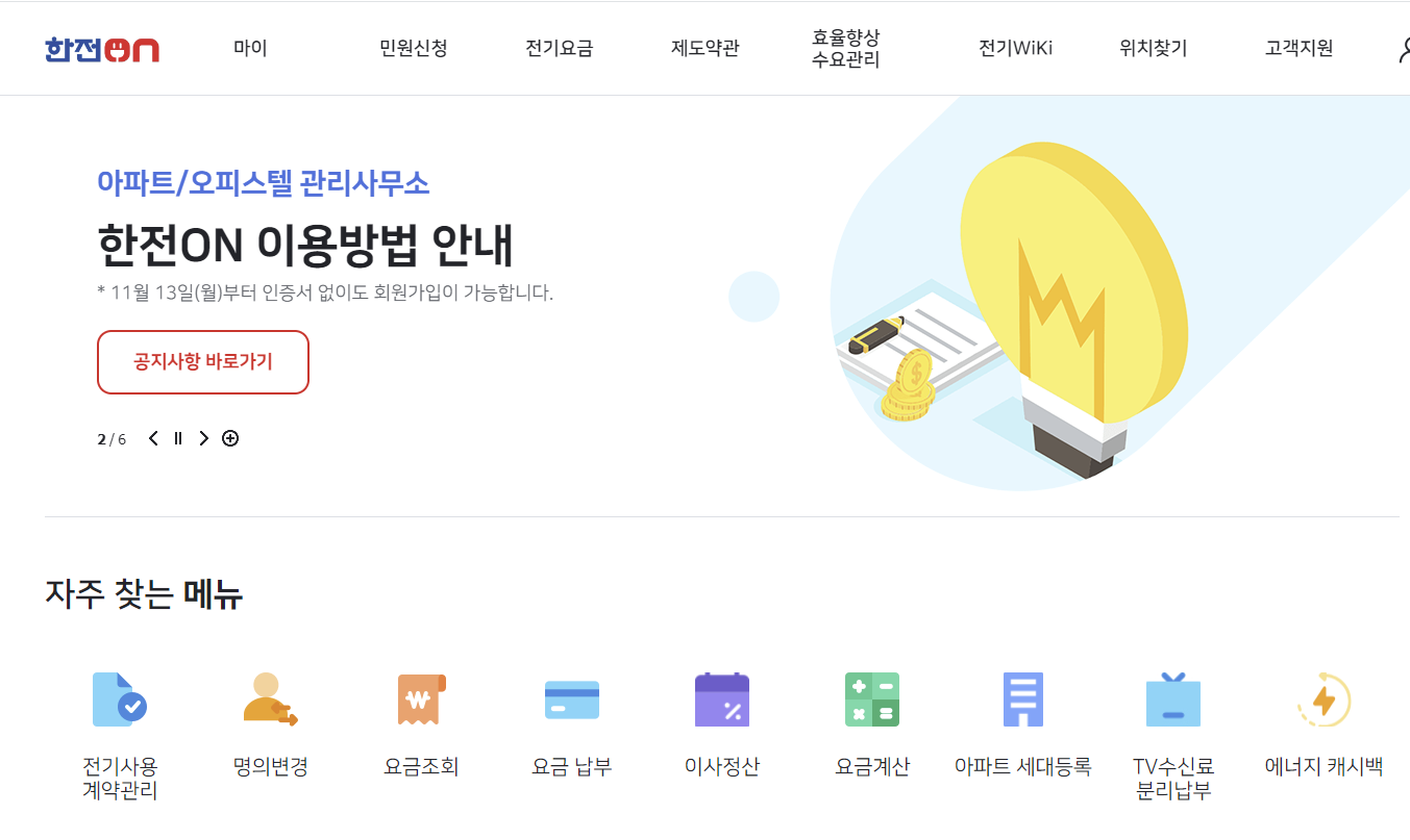 전기요금 조회 방법으로는 한전온 홈페이지에서 청구요금 조회, 사용량 및 전년동기 대비 사용량, 다음 달 예상 금액등 확이니 가능합니다.