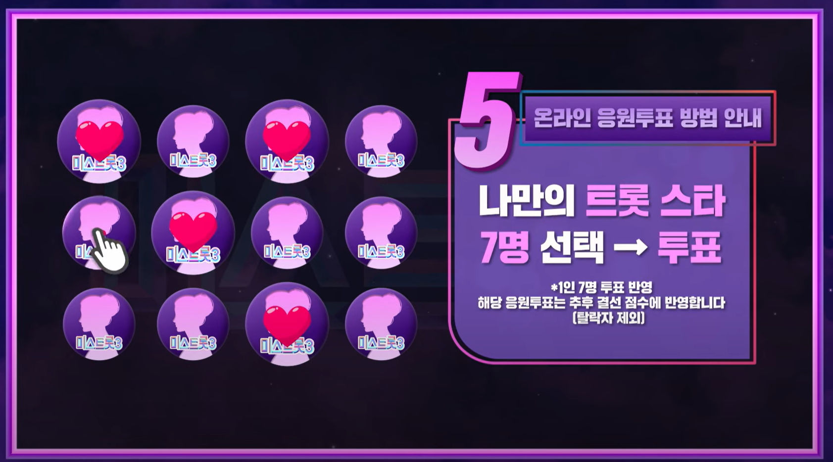 미스트롯3와 현역가왕은 대국민 투표로 TOP7을 선발하기 때문에 투표하기는 매우 중요합니다. 대국민 응원 투표는 다음 회차 방송에서 공개되며 결승, 준결승전에 점수가 반영됩니다.