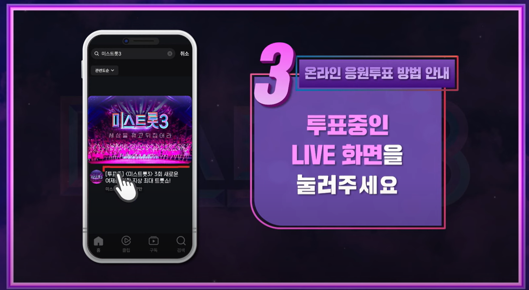 나우 NOW앱의 검색창에 미스트롯3 검색한 후 투표 중인 LIVE 화면을 눌러줍니다.