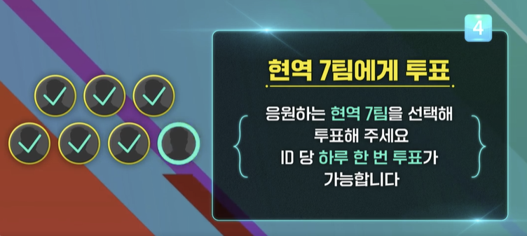 투표하고 싶은 현역가수 7명을 선택하고 투표하기를 눌러줍니다. 현역가왕 투표 역시 아이디당 하루 1번 투표할 수 있으며 투표결과는 매회 방송에서 공개됩니다.