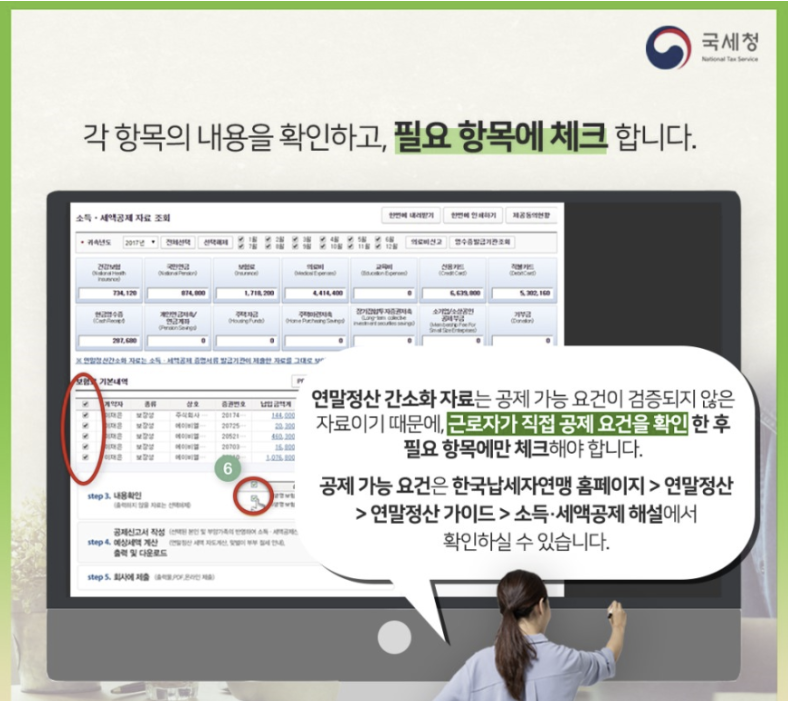 단, 연말정산 간소화 자료는 공제 가능 여부를 검증하지 않은 자료이므로 근로자가 직접 공제 요건을 확인하고 필요한 항목에만 체크해야 합니다.