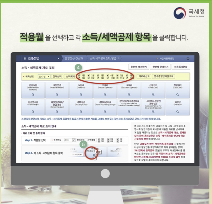 주요 발급 기관들이 전산파일로 제출한 소득과 세액공제 증명서류를 국세청에서 인터넷을 통해 근로자에게 제공합니다.