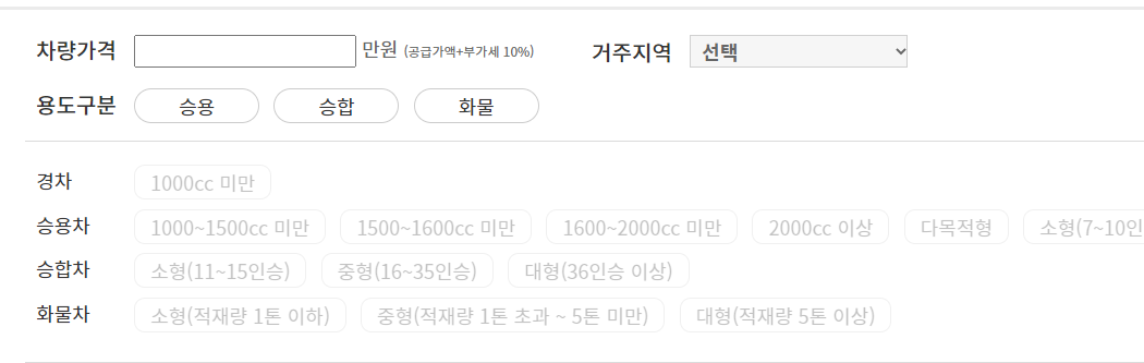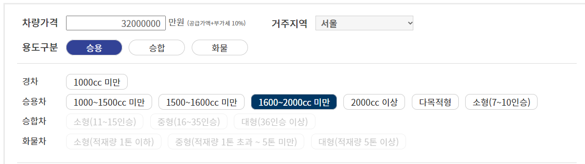 차량가격을 입력하고 거주지역, 용도구분등 해당하는 항목을 선택하고 '계산하기'를 클릭하면 취등록세를 간편하게 계산할 수 있습니다.