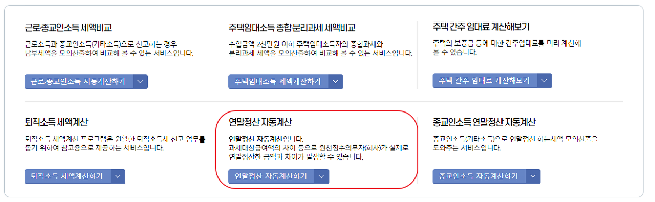 홈택스 홈페이지에서 연말정산 환급금 조회방법으로는 홈택스 홈페이지 메인 화면에서 '세금모의계산' 메뉴를 선택하고 '연말정산 자동계산'을 클릭합니다.