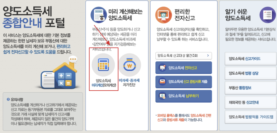 국세청 홈택스에서는 토지 양도소득세를 계산하기 쉽게 자동계산을 제공하고 있습니다. 양도소득세 계산기를 활용하여 손쉽게 양도소득세를 예상해 볼 수 있습니다.