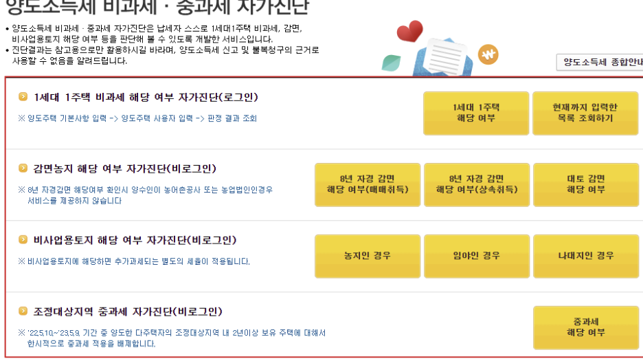 토지 양도소득세의 비과세 여부와 감면농지 여부를 확인하는 자가진단은 국세청에서 제공하고 있습니다.