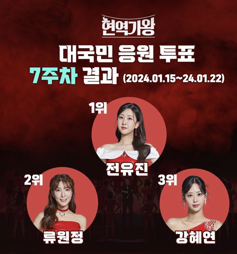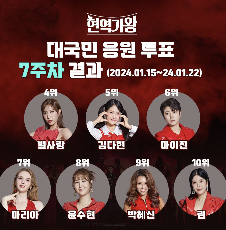 현역 참가자들의 무대만큼이나 현역가왕 투표열기도 뜨겁습니다. 지난 7주 차 투표 결과를 보면 1위 전유진, 2위 류원정, 3위 강혜연, 4위 별사랑, 5위 김다현, 6위 마이진, 7위 마리아, 8위 윤수현, 9위 박혜신, 10위 린이 차지했습니다.