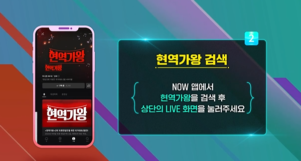 현역가왕 투표하기의 경우 NOW앱에서 공식 투표가 진행 중입니다. 앱 설치 후 현역가왕을 검색한 후 라이브 화면에서 모래시계 아이콘을 클릭하면 현역가왕 투표하기 페이지로 이동합니다.