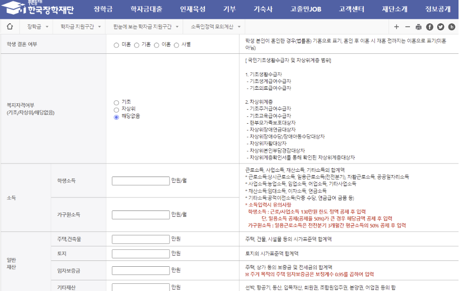 소득분위 모의계산에서 소득과 재산을 입력하면 국가장학금 소득분위를 모의계산 할 수 있습니다.