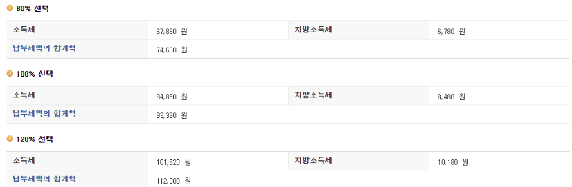 80%를 설정하면 월급에 대한 세금을 일부만 내고 연말정산 시 추가로 세금을 납부해야 하지만, 120%로 설정하면 월급에 대한 세금을 미리 나부하고 연말정산 시 초과분을 환급받을 수 있습니다.
