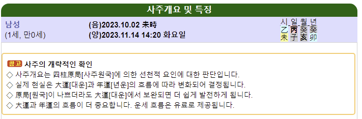 이후 만세력 상세 풀이를 보면 사주명식표가 나오는데요. 사주 명식표에는 만세력을 기준으로 사주 개요 및 특징을 확인할 수 있습니다.