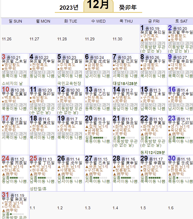보고 싶은 연도와 월을 선택한 후 결과보기 버튼을 클릭하면 만세력 달력 보기가 완료되는데요. 길흉과 방위 정도만 참고하시면 될 것 같습니다.