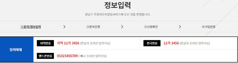 강남구를 선택하게 되면 서비스 신청 화면으로 이동하게 되는데요. 여기에서 차량번호, 핸드폰 번호, 자동방지 번호를 입력하면 주정차단속 문자알림 서비스 신청이 완료됩니다.