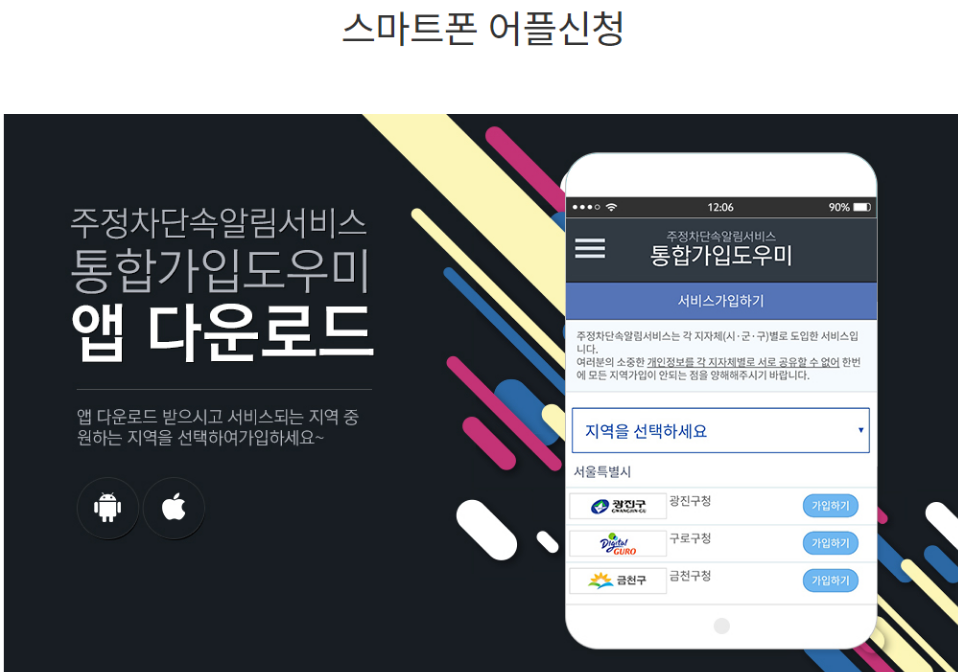 만약 앱을 통해서 신청하고 싶다면 주정차단속 알림서비스 앱을 통해서도 신청하시면 되는데요. 앱 설치 후 서비스 되는 지역 중 원하는 지역을 선택하기만 하면 신청이 완료됩니다.
