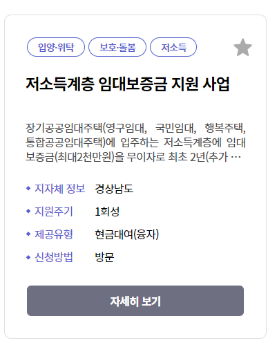 주거 혜택으로는 독거노인 응급 안심 서비스, 방과 후 보육료 지원, 언어 발달 지원 등이 제공됩니다. 또한, 스포츠 강좌 이용권, 통합 문화 이용권, 산림 복지 서비스 이용권 등의 지원 혜택도 받을 수 있습니다.