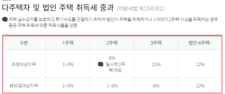 2 주택자의 경우, 조정대상지역에서는 8%의 취득세율이 적용되며, 그 외 지역이라면 1~3%의 취득세율이 적용됩니다. 3 주택자는 조정지역에서는 12%, 그 외 지역에서는 8%의 취득세율을 적용합니다.