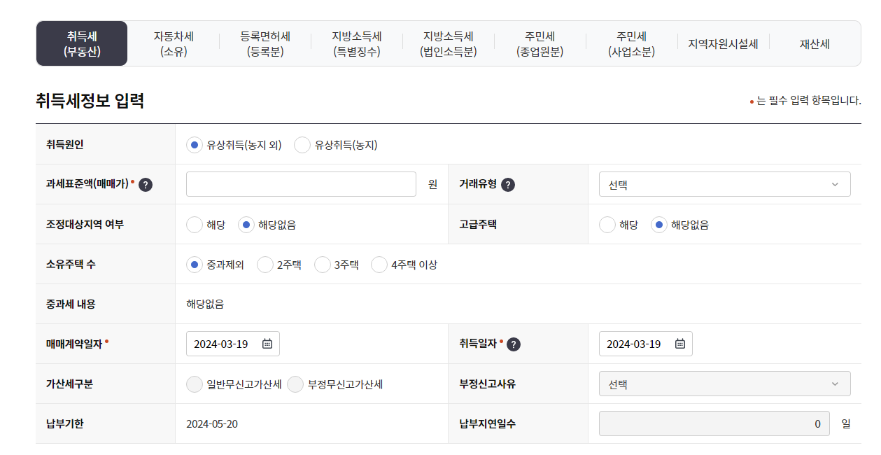 위택스 홈페이지에서 취득세 등록세 계산기를 사용하면 부동산의 취득가액과 조정대상지역 여부등을 입력하면 자동으로 취득세, 농어촌특별세, 지방교육세를 포함한 총취득세를 계산해 줍니다.