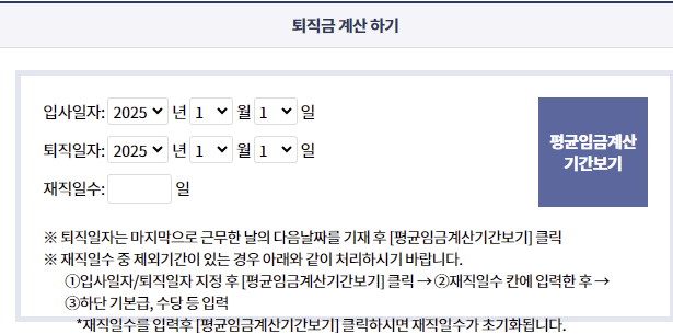 직접 계산하기 번거로울 때는 고용노동부에서 제공하는 퇴직금 계산기를 활용하는 것이 좋습니다. 퇴직금 계산기 화면에서 입사일자, 퇴직일자 등을 입력하면 예상 퇴직금을 쉽게 계산할 수 있습니다.