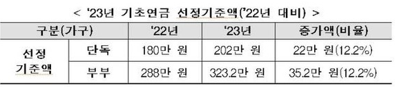 가구 소득인정액이 선정기준액 2023년 기준 단독가구 202만 원, 부부 가구 323만 원이면 수급자격이 됩니다. 소득인정액은 월 소득이 아닌 소득과 재산의 소득환산액을 구한 결과 값입니다.