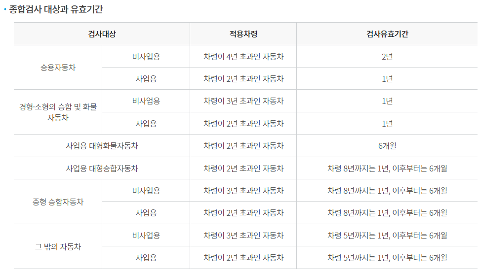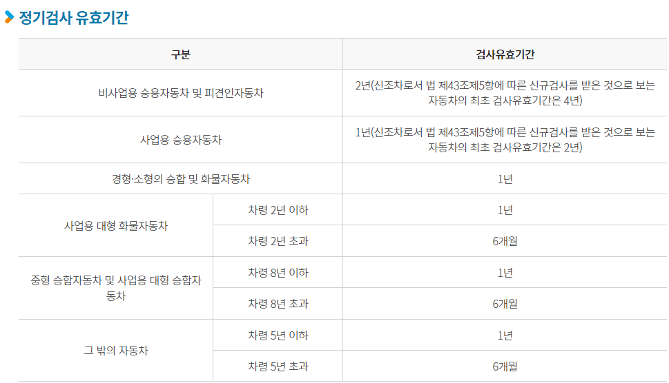 자동차검사 기간 주기는 차량의 종류와 용도에 따라 자동차검사 주기가 달라지는데요. 일반 승용차는 최초 등록 후 4년, 이후 2년마다 사업용 승용차 및 승합차는 최초 등록 후 2년, 이후 매년 자동차검사를 받아야 합니다.