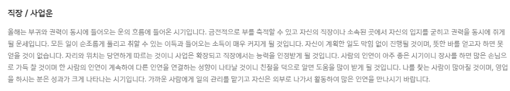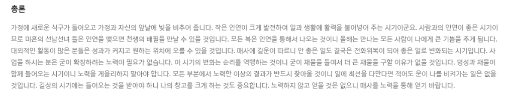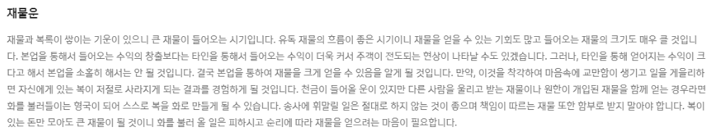 사주용어를 모르더라도 쉽게서술되어 있어 이해하기가 쉽고 자신의 총운과 함께 재물운, 사업운 등도 확인할 수 있습니다.