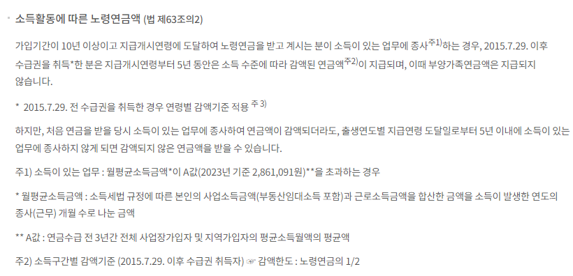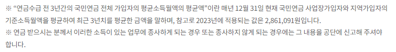 그러나 소득이 있다고 해서 무조건 감액이 되는 것은 아니고 월평균 소득금액이 국민연금 전체 가입자의 평균 소득월액을 초과하는 경우 감액이 됩니다.