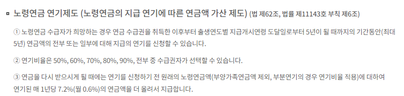 연기연금은 국민연금 받는 시기를 늦추는 대신 내가 받을 연금에 이자를 더해 받을 수 있습니다. 1회에 한해 연금 받는 시기를 최대 5년까지 연기할 수 있으며 1년당 7.2%의 연금액을 더 올려서 받을 수 있습니다.