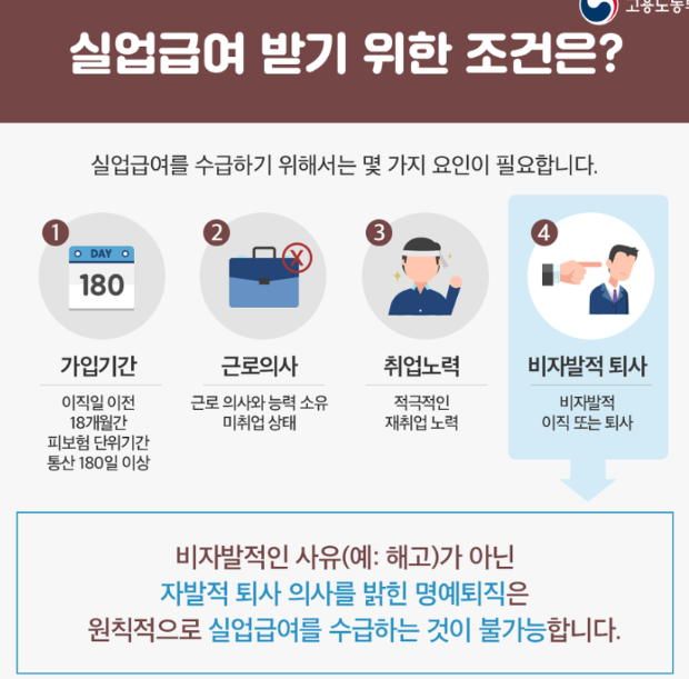 또한 정당한 사유 없이 근로계약을 위반하였거나, 무단결근을 한 경우, 3개월 이내 수습기간, 월급 근로자로 6개월 기간 미충족자인 경우도 비자발적 퇴사에 해당하지 않아 실업급여를 받을 수 없습니다.