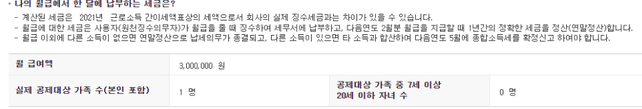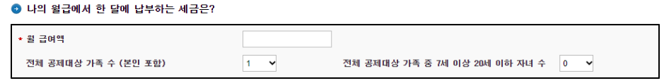 홈택스 홈페이지서 소득과 공제대상, 가족등에 해당하는 내용을 입력한 후 계산하기를 클릭하면 간단하게 소득세를 자동 계산할 수 있습니다.