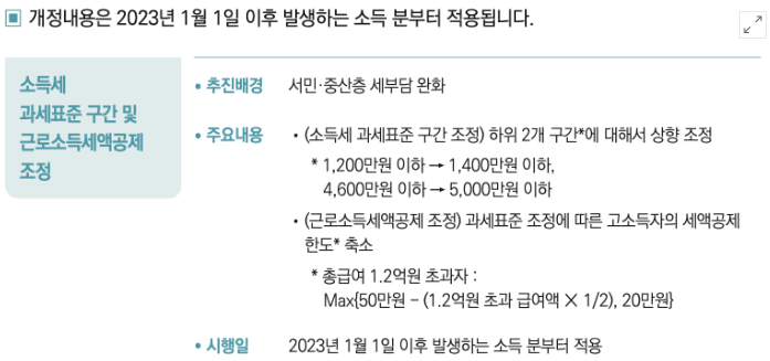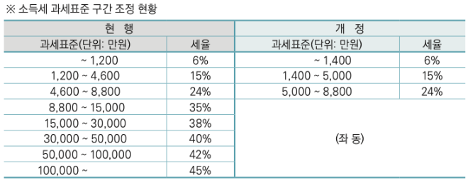 이후 구간인 1,200만 원 초과에서 4,600만 원 이하가 15% 였는데, 5,000만 원 이하로 상향 조정되었습니다. 이후 구간은 이전과 동일합니다.