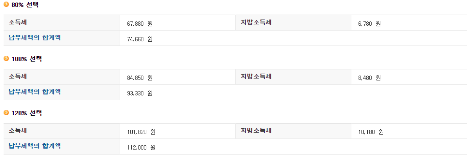 소득에 따라서 세율과 공제가 다르기 때문에 본인의 보다 정확한 소득세 계산을 위해서는 홈택스 홈페이지에서 소득세 계산기를 이용해서 계산해 보시길 권장드립니다.