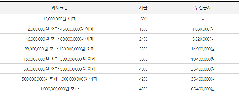 7. 과세표준 10억 원 초과 세율 45% 누진공제 6,540만 원