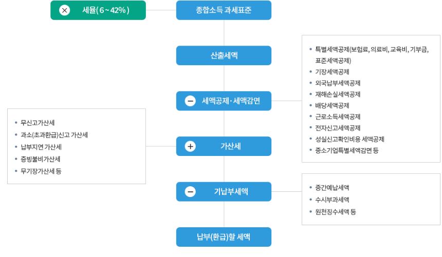 종합소득 과세표준에서 종합소득세율을 적용하면 산출세액이 나오며 여기에서 세액공제나 세액감면되는 금액을 빠지면 결정세액이 나옵니다.