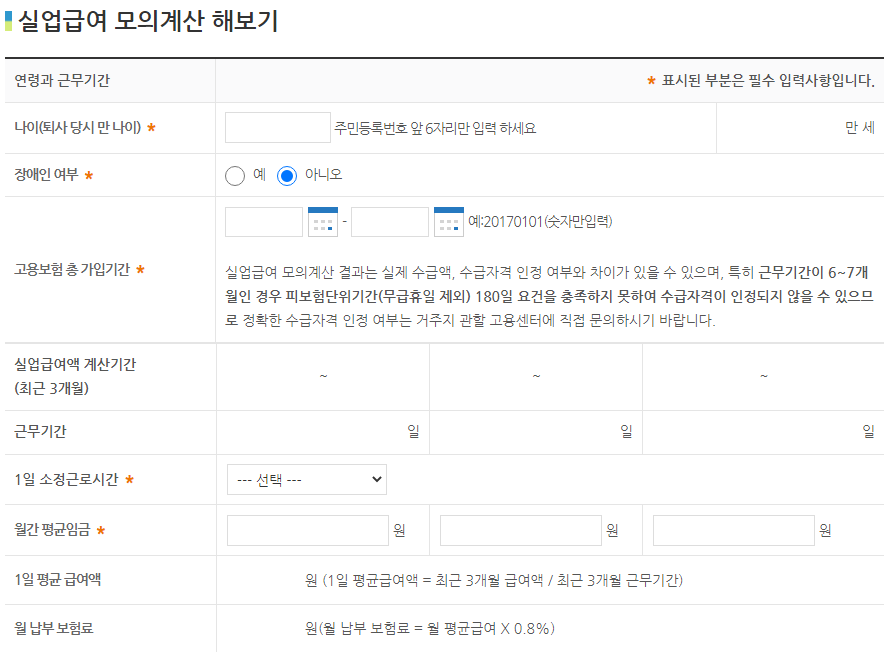 내가 받을 수 있는 실업급여 금액을 알고 싶다면 정부 고용노동부 홈페이지를 통해서 실업급여 금액 모의계산기에서 실업급여 금액을 계산해 볼 수 있습니다. 퇴사 당시 나이 및 1일 소정근로시간, 3개월 평균 임금을 입력하면 실업급여 금액을 확인할 수 있습니다.