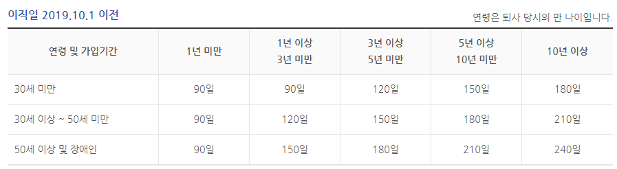 실업급여를 받을 수 있는 기간은 나이와 일한 기간에 따라 달라지며, 이때 나이는 퇴사 당시의 만 나이를 기준으로 합니다. 실업급여 수급기간은 최소는 120일이고 최장은 270일입니다.