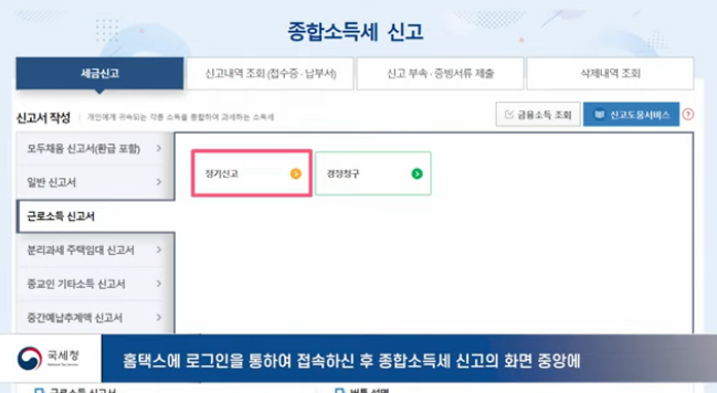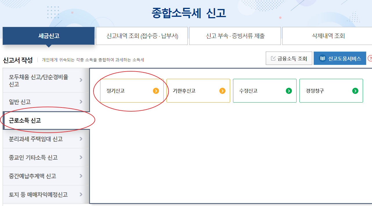 이후 '종합소득세 신고하기'를 클릭한 후 '근로소득자 신고서'에서 '정기신고'를 클릭합니다. 5월에는 정기신고를 하는 기간이기 때문에 '정기신고'를 신청하고 5월에 신고를 하지 못했다면 '경정청구'에서 신청하면 됩니다.