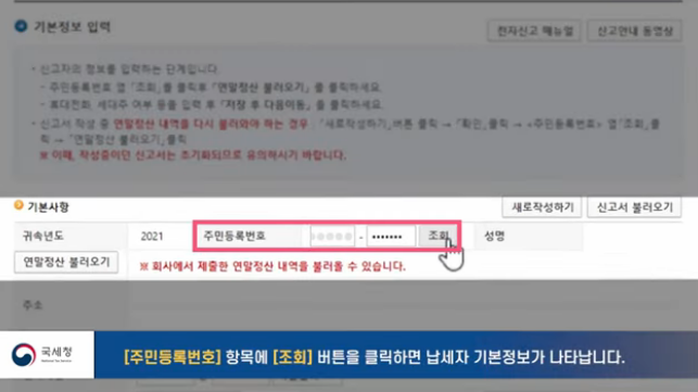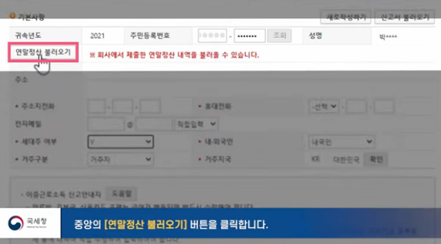 이후 주민등록화면에서 조회버튼을 클릭하면 납세자 기본정보가 나옵니다. 그리고 귀속연도 아래의 연말정산 불러오기 버튼을 클릭하면 됩니다.