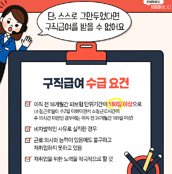 더불어 비자발적인 사유로 실직한 경우, 근로 의사와 능력이 있음에도 불구하고 재취업을 하지 못하고 있어야 하며, 재취업을 위한 노력을 적극적으로 해야 실업급여 조건이 됩니다.