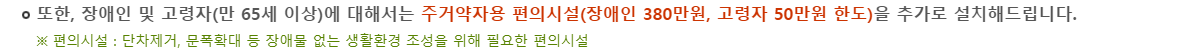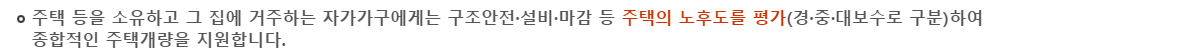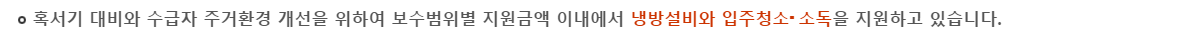 자가로 살고 있는 경우 가구에 주택수선비가 지원됩니다. 노후된 주택의 개보수를 진행하거나 장애인 또는 고령자용 편의시설을 만들거나 냉방설비 또는 입주 청소 또는 소독비용을 지원해 줍니다.
