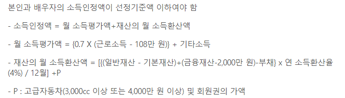 - 소득인정액 = 소득평가액 (실제소득 - 가구특성별 지출비용 - 근로소득공제)+재산의 소득환산액