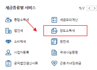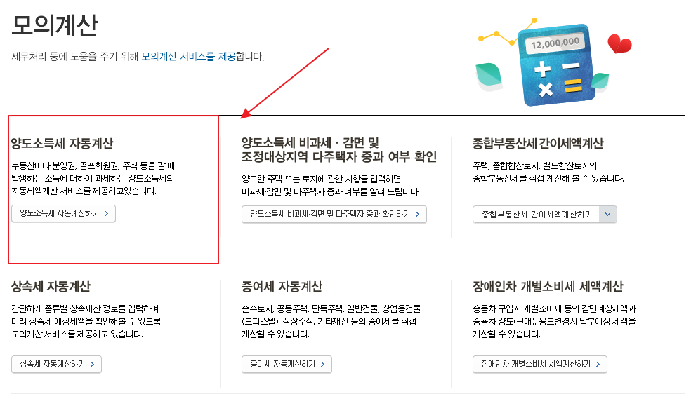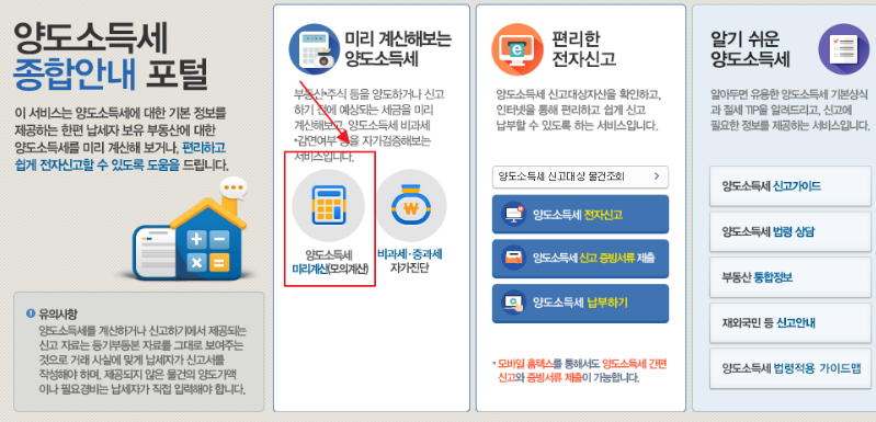 홈택스 홈페이지에서 들어가면 '세금모의계산' 메뉴가 있습니다. 양도소득세 이외에도 종부세, 상속세, 증여세 등등 다양한 세금에 대하여 모의계산 할 수 있으니 세금 계산할 일이 있으면 여기서 이용하면 가볍게 모의계산 해볼 수 있습니다.