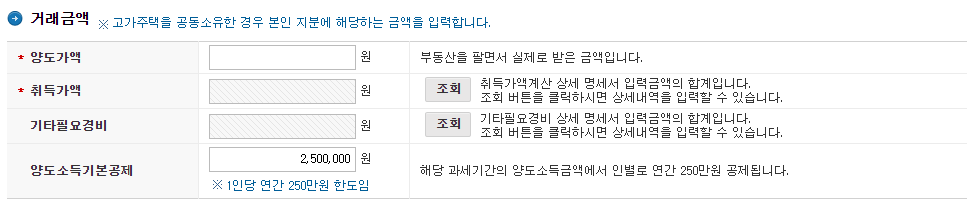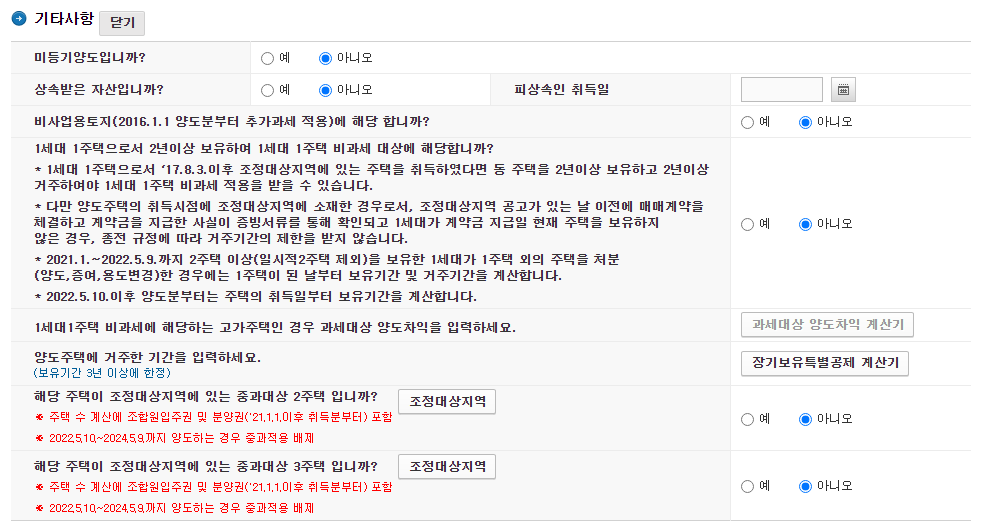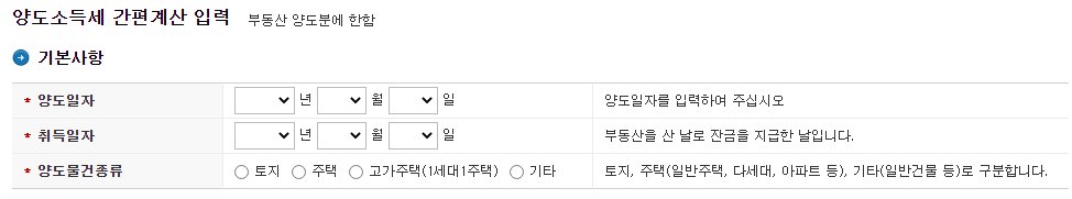 위의 바로가기를 클릭하면 양도소득세 자동계산 페이지로 이동합니다. 양도소득세 자동계산 계산기를 이용하면 본인의 상황을 어느 정도 정확하게 입력하면 대략적인 양도소득세를 확인할 수 있습니다.