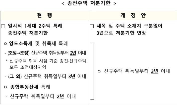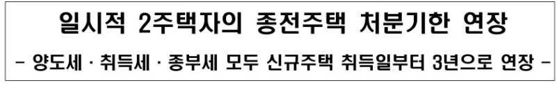 지난해까지만 해도 2년 내 종전 주택을 팔아야 했지만 양도세 면제 기간이 3년으로 변동되었습니다. 즉, 일시적으로 1 가구 2 주택 양도세 비과세 요건 혹은 특례 적용 기한이 2년에서 3년으로 1년을 연장하게 된 것입니다.