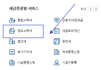 이런 경우 홈택스 양도세 계산기를 이용하면 간단하게 양도세를 계산할 수 있습니다. 위의 바로가기를 클릭하면 양도세를 계산할 수 있는 홈택스로 이동합니다. 홈택스 홈페이지 메인화면에 양도소득세 메뉴를 선택하면 양도세 자동계산을 할 수 있습니다.